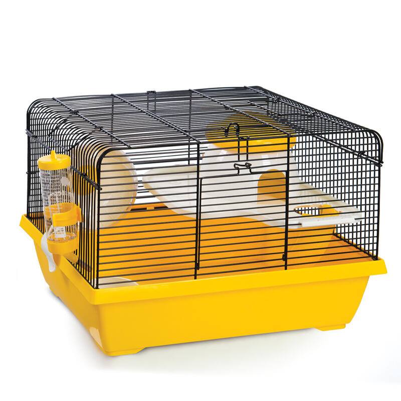 Клетка прямоугольной формы с горизонтальными прутьями подходит для мелких домашних животных вроде крыс, мышей и хомяков. В комплектацию изделия также входят: пластиковая миска, поилка, уютный домик и беговое колесо.
