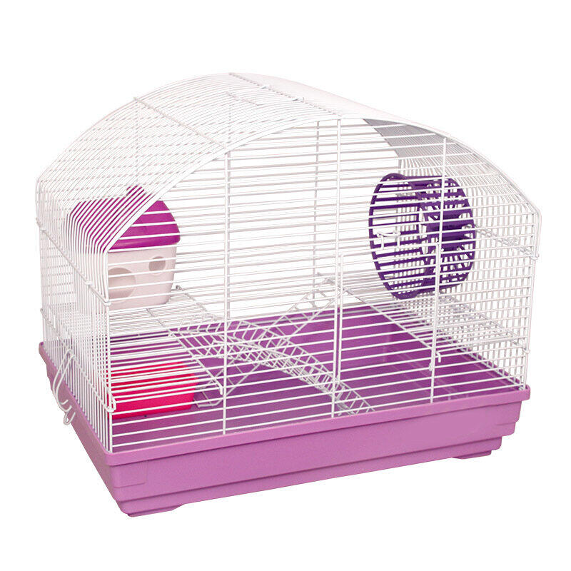 Двухэтажная клетка прямоугольной формы с округлой крышей подходит для мелких домашних животных вроде крыс, мышей и хомяков. В комплектацию изделия также входят: пластиковая миска, уютный домик на втором этаже и беговое колесо. Кроме того, клетка оборудована удобной ручкой на крыше, облегчающей процесс переноски изделия.